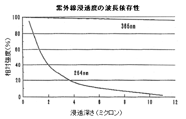 | 用于紫外線固化的紫外線的波長(zhǎng)主要是汞的發(fā)射線光譜的254nm和365nm。盡管254nm紫外線具有高能量,但是它們具有不容易到達(dá)紫外線樹(shù)脂內(nèi)部的性質(zhì)。盡管365nm紫外線的能量很小,但是它滲透到相對(duì)紫外線樹(shù)脂的內(nèi)部。參見(jiàn)下圖。 |